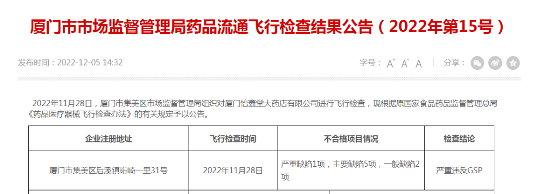 《公告》指出,2022年11月28日,廈門市集美區(qū)市場監(jiān)督管理局組織對廈門怡鑫堂大藥店有限公司進行飛行檢查,發(fā)現(xiàn)其存在嚴重缺陷1項,主要缺陷5項,一般缺陷2項。