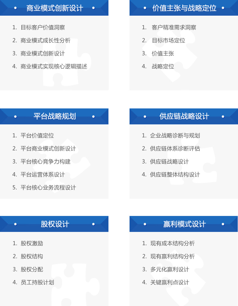 幫助企業(yè)發(fā)現(xiàn)消費(fèi)者精準(zhǔn)需求,實(shí)現(xiàn)目標(biāo)客戶精準(zhǔn)定位,突破邊界,幫助企業(yè)整合資源,開放式創(chuàng)新,構(gòu)建多元化贏利模式與運(yùn)營系統(tǒng),打造競爭壁壘,幫助企業(yè)打造實(shí)現(xiàn)持續(xù)贏利的系統(tǒng)。