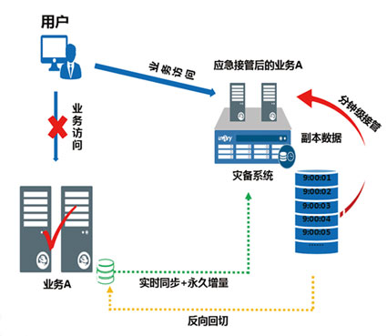 當生產(chǎn)機出現(xiàn)故障后,可自定義輸入任意時間點(RTO分鐘級)進行應急接管。