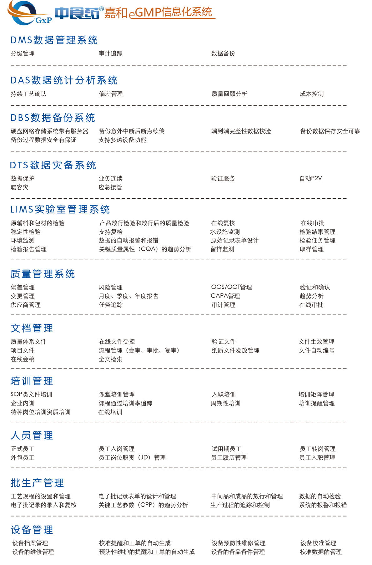 “嘉和eGMP信息化系統(tǒng)”全面企業(yè)級(jí)解決方案,模塊化的系列產(chǎn)品滿足用戶各種需要。作為中國首個(gè)產(chǎn)品化GMP合規(guī)性管理系統(tǒng),采用信息技術(shù)實(shí)現(xiàn)了企業(yè)生產(chǎn)過程、質(zhì)量控制過程、質(zhì)量管理過程的自動(dòng)化和流程化;通過大數(shù)據(jù)技術(shù)運(yùn)用,對(duì)GMP過程中產(chǎn)生的各種數(shù)據(jù)進(jìn)行深度整合、加工和挖掘,為企業(yè)提供了豐富的管理和決策依據(jù)。